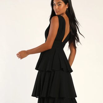 Chiffon is one of the few fabrics that can feel light and breezy while still hitting the formal mark. Perfect for summer weddings, it offers movement without sacrificing elegance. The Tier and Now Black Tie-Back Tiered Maxi Dress from Lulu’s features a deep V-neckline that pairs beautifully with a strand of pearls, and a tiered skirt that brings just the right amount of drama. Style it with satin ankle-strap heels and a sleek clutch for a look that’s polished and event-appropriate. Be sure to use a Lulu’s promo code for an extra bit of savings.