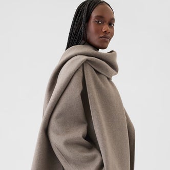 If you're looking to make a bold and unexpected statement in the new year, consider this red double-faced wool blend coat. Its oversized silhouette is perfect for layering, and it includes a removable scarf that resembles a cape, allowing you to wrap, drape, or tie it in various ways as you prefer.